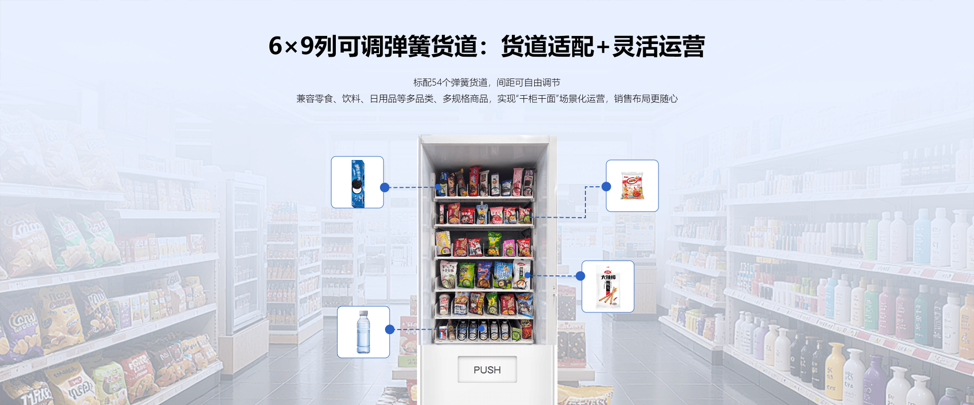 支持8*10个货道,支持柜体灯亮度调节,支持拓展副柜