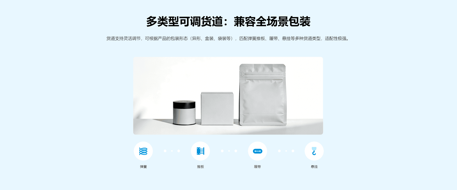 左右柜均为7层13列推板货道,单柜91个货道,合计182个SKU。(可调、可定制)